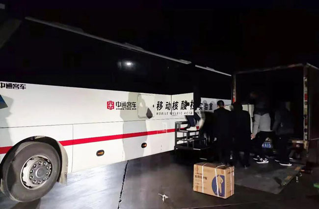 客车式5G移动核酸实验室,该检测车采用大型高端客车平台,严格按照生物安全实验室P2+要求设置,单车具备每天20000份的核酸混检能力,可在2小时内出结果,5G数据实时传输,极大地提升了疫情检测和相应处置效率。