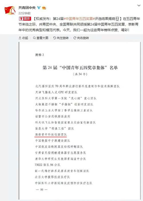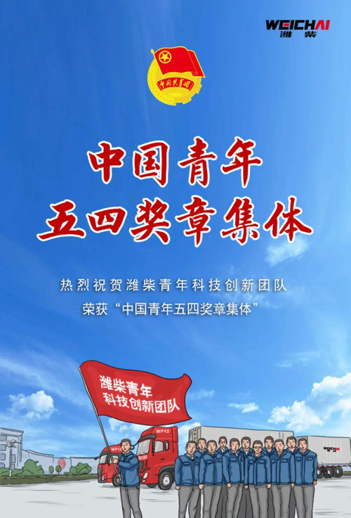 在五四青年节来临之际,共青团中央、全国青联共同颁授第24届“中国青年五四奖章”,表彰青年中的典型和模范代表。潍柴青年科技创新团队荣获第24届“中国青年五四奖章集体”。