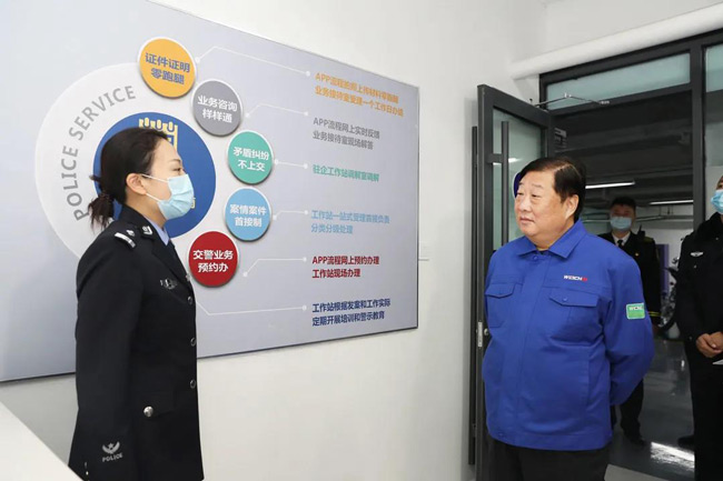 在潍坊市公安局高新分局驻企工作站,谭旭光肯定了工作站在服务员工、维护企业安全等方面取得的成绩。谭旭光说:要打造独具潍柴特色的“警企共建、三联筑基”模式,为企业高质量发展保驾护航!