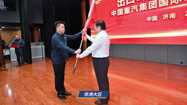 5月24日上午10时,中国重汽集团隆重召开“出口8万辆·再攀新高峰”国际市场誓师动员大会,谭旭光向国际市场6大区域负责人授旗并讲话。