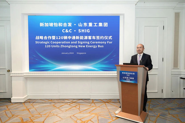 1月25日下午,山东重工集团与新加坡怡和合发集团签署战略合作框架协议暨120辆中通新能源客车采购协议。中国驻新加坡大使馆公使衔参赞宗长青、新加坡怡和合发集团东南亚常务董事符思仁、谭旭光出席活动并致辞。