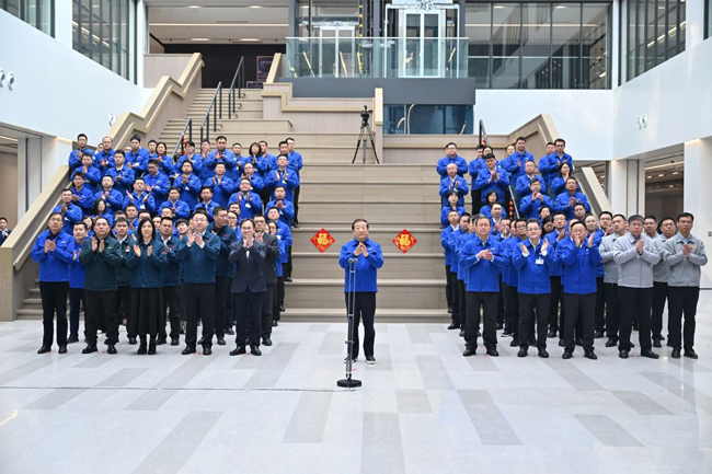 2月9日大年三十下午2:00,谭旭光率领国内集团8家权属公司2万名科技人员、领导干部,向1500名坚守高寒试验一线的科技人员、坚守国际市场一线抢抓订单的海外营销将士拜年。