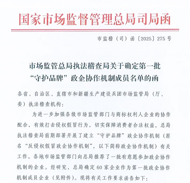 “守护品牌” 政企协作机制由国家市场监督管理总局执法稽查局牵头设立,旨在贯彻落实国家知识产权保护战略,通过强化各级市场监管部门与商标权利人企业之间的协作,凝聚各方力量,形成打击侵权假冒的强大合力,从而维护消费者的合法权益,保障市场的公平竞争秩序。此次首批成员名单经全国各地市场监管部门推荐,总局层层筛选,60家企业入选。